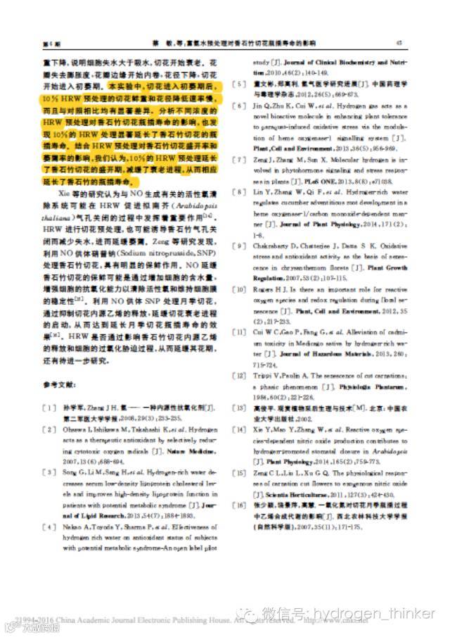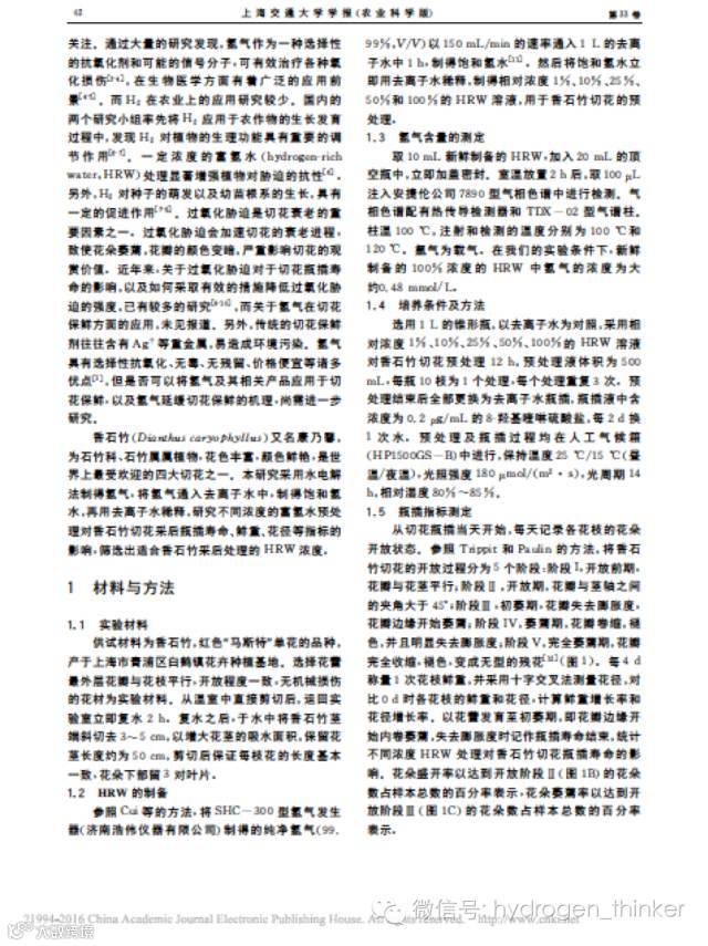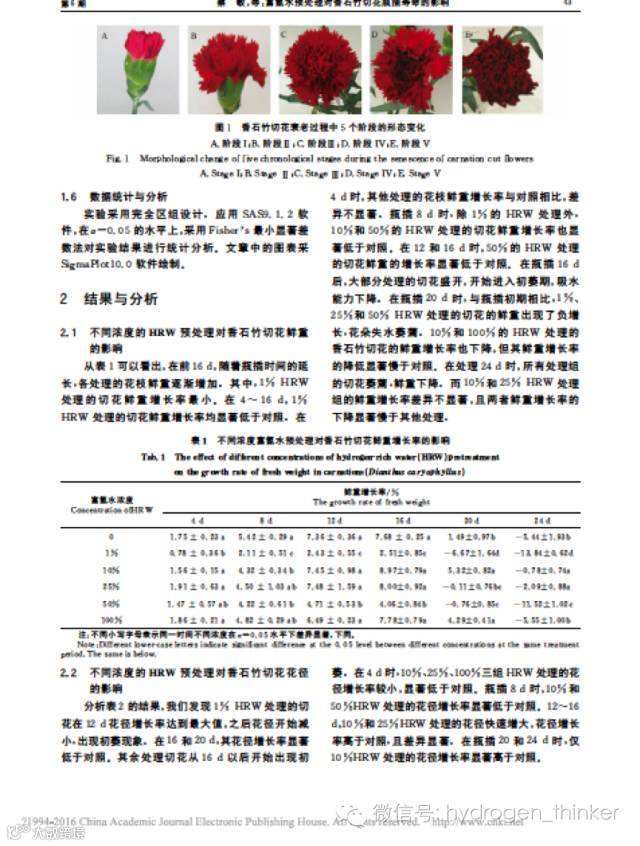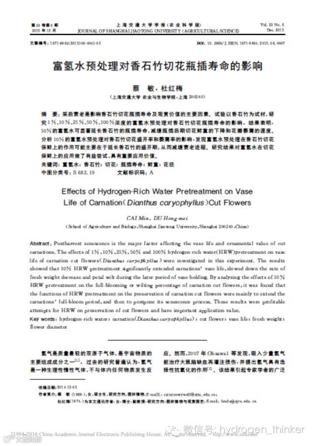 这个研究说明,氢水养花能延长寿命。氢气生物学效应发现以来,不仅在医学上受到广泛关注,也受到来自植物生物学领域的重视。尤其是中国南京农业大学、中国科学院、甘肃农业大学等单位先后证明氢气对提高植物抗逆能力,促进植物生长等方面的显著作用。最新来自上海交通大学农学院杜红梅教授课题组的研究,用瓶插花的寿命作为指标,证明氢水对延长植物寿命的作用。说明氢气不仅能提高植物抗病能力,而且具有延长寿命的作用。