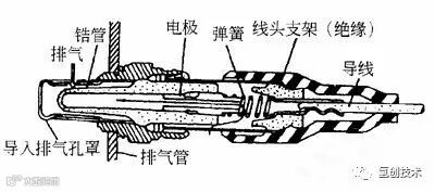 氧化锆式氧传感器主要由氧化锆(ZrO2)、和护套组成。导人排插入排气管中,它的内表面与空气相通,外表面与废气相通。锆管的内、外表面覆盖一层多孔性铂膜作电极,为防止废气腐蚀铂膜,在锆管外表面的铂膜层上覆盖一层多孔陶瓷层,并有一个防护套管,套管上开有槽口或孔。氧传感器的接线端有一个金属护套,上面开有孔,使锆管内表面与空气相通,电线将锆管内表面铂极经绝缘套从传感器引出。