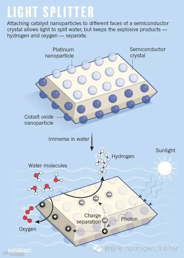 中国科学院大连催化基础国家重点实验室主任李灿使用铂和氧化钴纳米颗粒制造出用太阳光分解水的催化剂。他把纳米颗粒贴在氧化铋钒半导体材料上,把不同类型的颗粒分别贴在每个晶体面,然后将晶体浸入水中进行光照,光子打击半导体释放电子,形成电流,纳米颗粒利用电流把水分离为氢气和氧气。氧气从氧化钴颗粒形成,而阴极吸引氢离子汇集在铂纳米颗粒形成氢气。