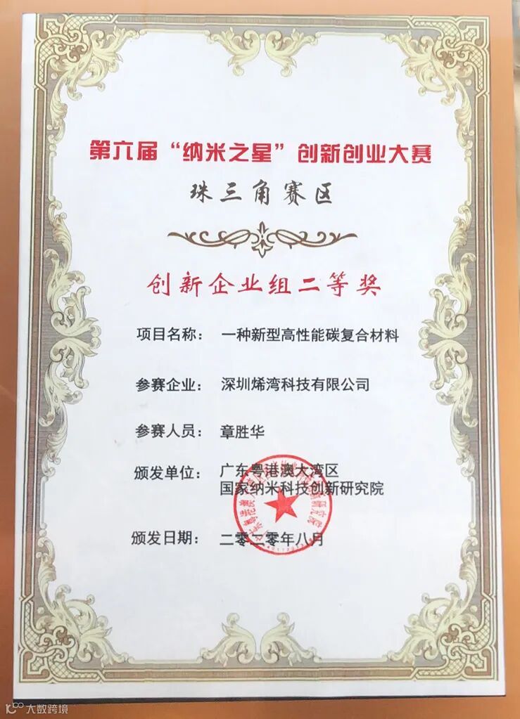 8月11日,由广州市黄埔区科学技术局指导、纳米科技产业技术创新战略联盟和国家纳米科学中心主办、广东粤港澳大湾区国家纳米科技创新研究院承办的第六届“纳米之星”创新创业大赛珠三角赛区在广州举行,烯湾科技获得创新企业组二等奖,并成功入围国赛总决赛。