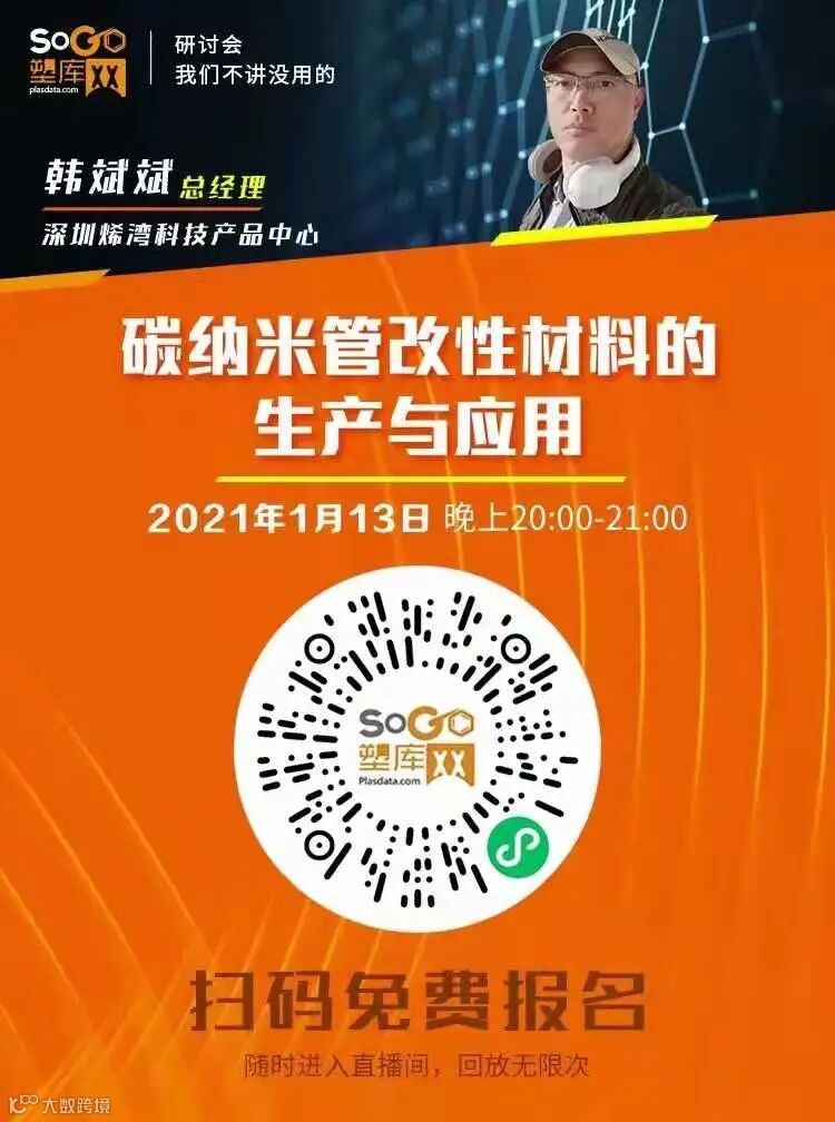 深圳烯湾科技有限公司产品中心总经理韩斌斌,将于1月13日晚20:00-21:00在塑库网直播间和大家见面,为大家详细地讲解碳纳米管在改性材料方面的生产与应用。