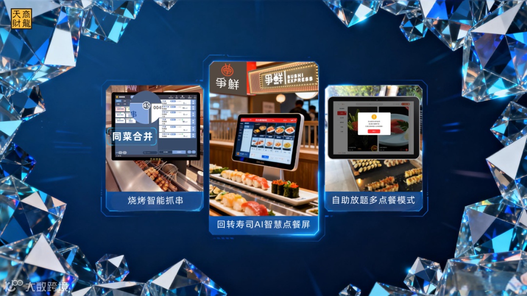 针对烧烤的出餐慢、日料的鲜度管控、自助的高峰压力,提供专属数字化工具,如烧烤业态有智能合并抓串与超时预警功能,日料回转寿司搭配 AI 点餐屏(视觉化选品 + 互动玩法)与精准传菜,自助放题支持多模式点餐与区分化厨打,助力很久以前羊肉串、争鲜等品牌的高效运营可快速复用,全方位满足细分赛道运营需求。