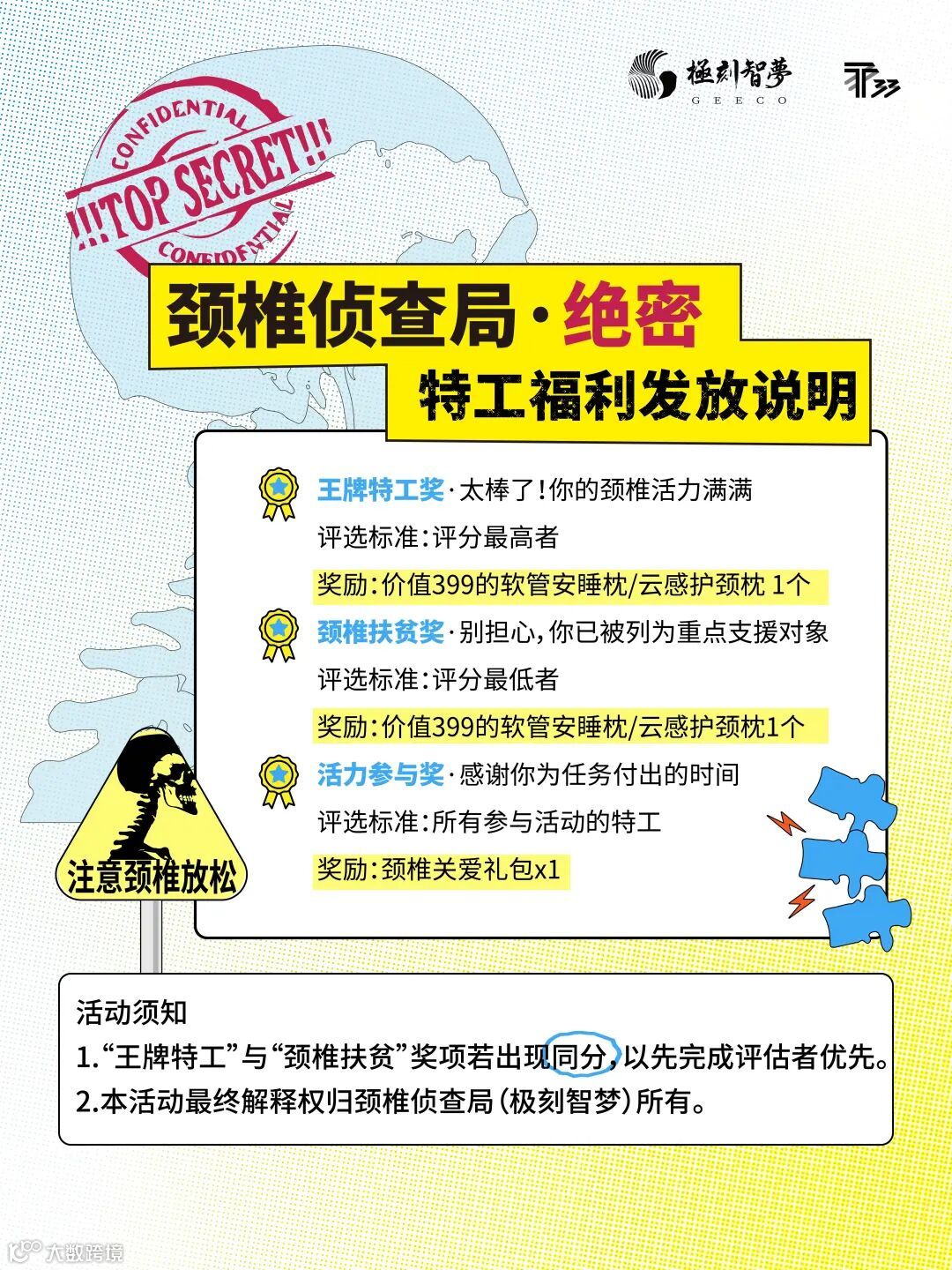 告别“凭感觉判断颈椎状态”,用科学测评解锁你的颈椎真实 “年纪”,更有王牌特工奖、颈椎扶贫奖等你拿,参与就有奖,各位特工速来报到!