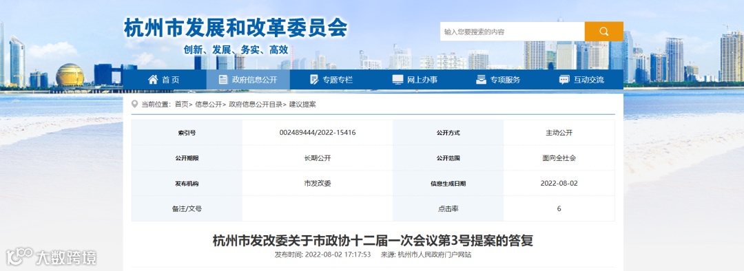 8月2日,杭州市发改委公布了关于市政协十二届一次会议第3号提案的答复。