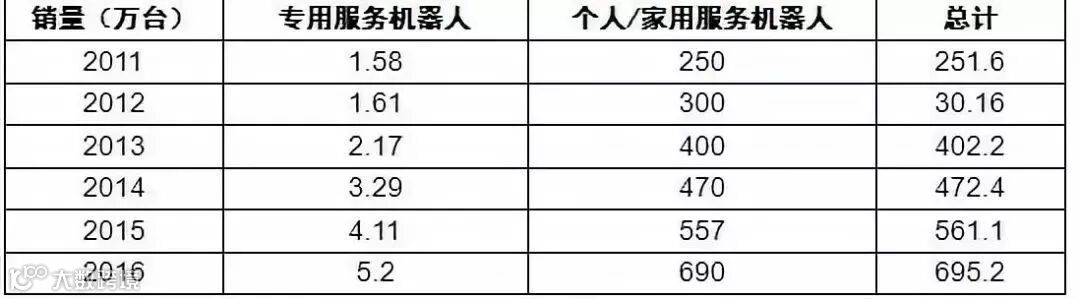 2016年,全球专业服务机器人的销量是5.2万台,个人/家用服务机器人的销量达到690万台,全球服务机器人销量达到695.2万台。
