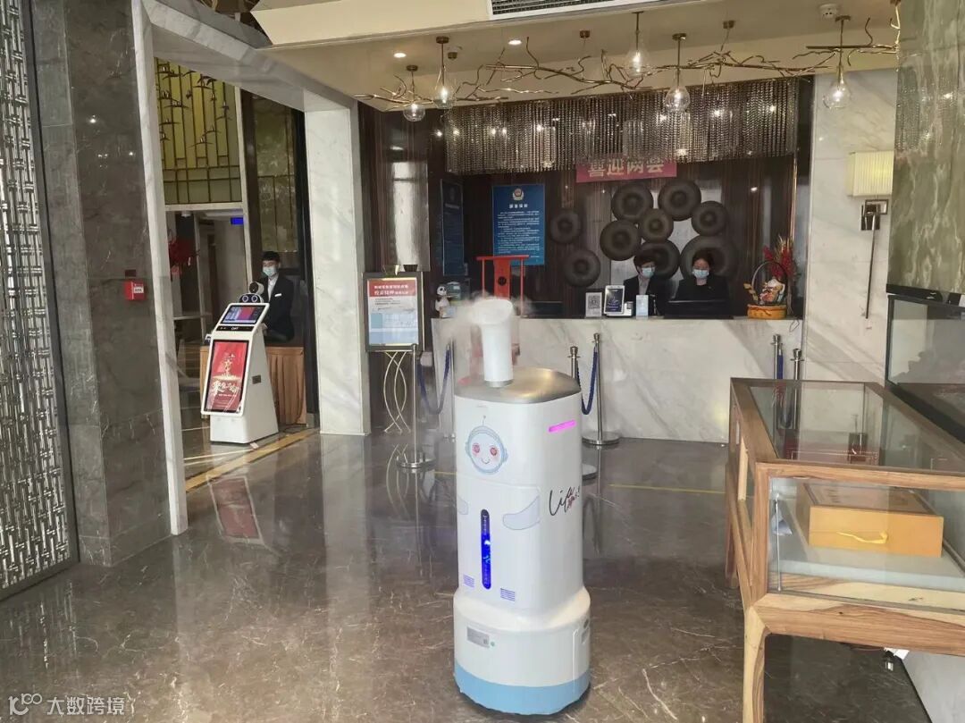 消毒喷雾机器人则在北京明宇丽雅饭店负责日常消杀工作。机器人可以通过内部消毒系统及硬件设备,对地面及室内空气完成消毒灭菌工作。机器人还能够根据设定的路线或地点自动并高效、精准作业。展馆人员来往频繁,防疫压力大。消毒喷雾机器人可以24小时不间断对大堂、门厅、走廊等区域进行消杀。