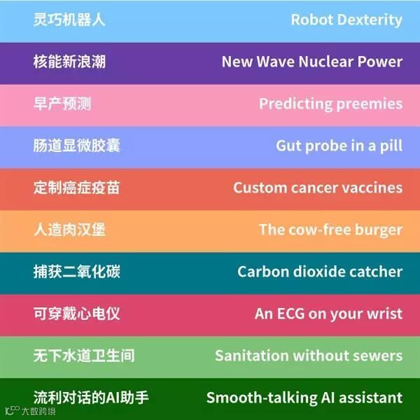 除了AI助手以外,今年MIT评选出的“十大突破性技术”还包括“灵巧机器人”、“核能新浪潮”、“早产预测”、“肠道显微胶囊”、“定制癌症疫苗”、“人造肉汉堡”、“捕获二氧化碳”、“可穿戴心电仪”、“无下水道卫生间”。