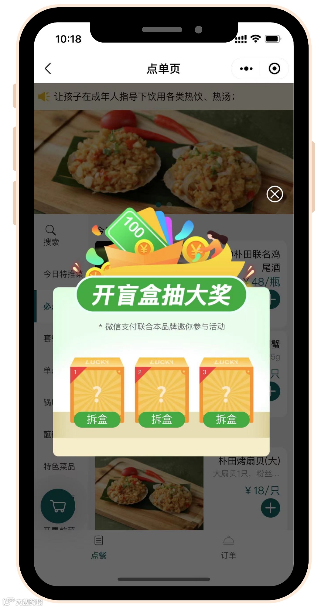 堂食。当消费者在天财商龙智慧餐厅小程序完成点餐后,会在支付页自动跳转到抽盲盒活动,提升消费者线上点餐的惊喜体验。