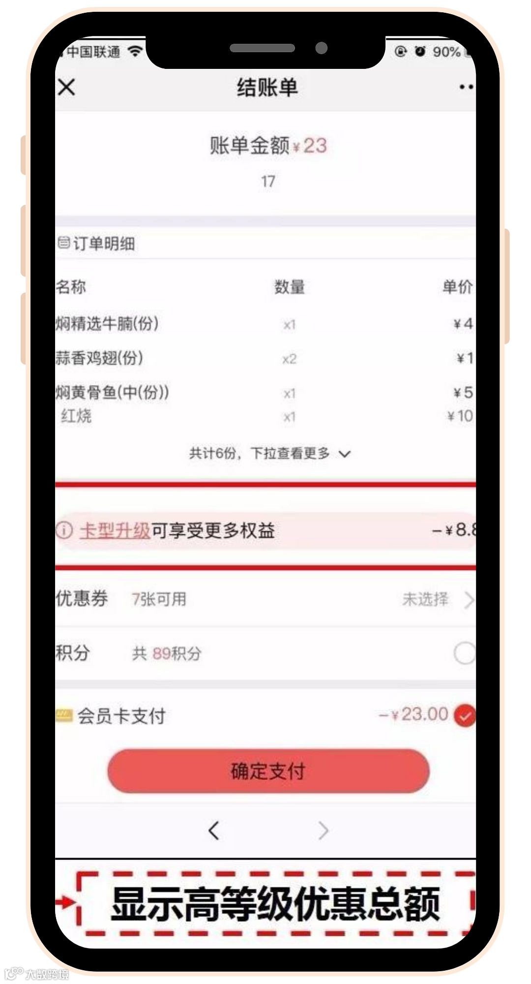 如果点餐时顾客还未成为会员,那么TA将看到初级会员的会员价,在支付时可见更高等级卡型优惠总额。