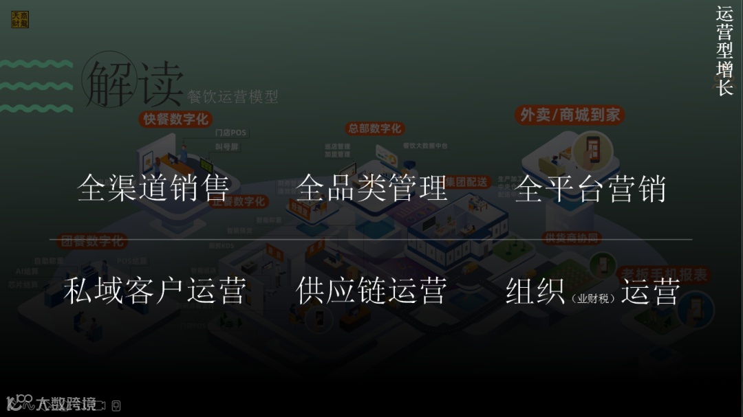 去年两会提出的“数字化转型”开启了中国经济 “运营型增长”的下半场,核心是现有规模之下聚焦存量资源的高质量运营;对于餐饮行业而言,通过全渠道销售、全域顾客运营及全供应链管理的全域经营模式,结合现有供应链及客户资源持续挖掘及持续创造价值,将是今后最重要的发展方向。
