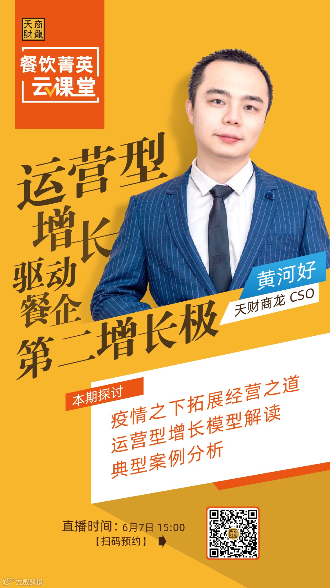 6月7日15点,天财商龙餐饮菁英云课堂邀请天财商龙CSO黄河好做客线上讲堂,为餐饮企业经营者带来主题为“运营型增长——驱动餐饮第二增长极”的分享。