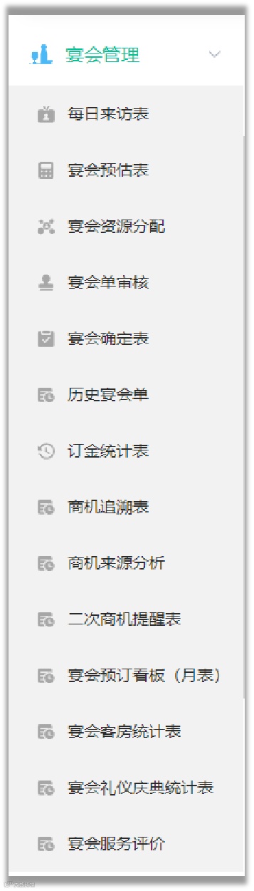 宴会预订,往往并不能通过一通电话即可完成,周期长节点多易出错,来源复杂。天财商龙宴会版智能预订系统通过这四点管理标准:节点有报表、跟踪有记录、主动能提醒、转化看得见,实现线索-跟进-合同-举办-回访-客诉处理-转介绍的服务闭环。