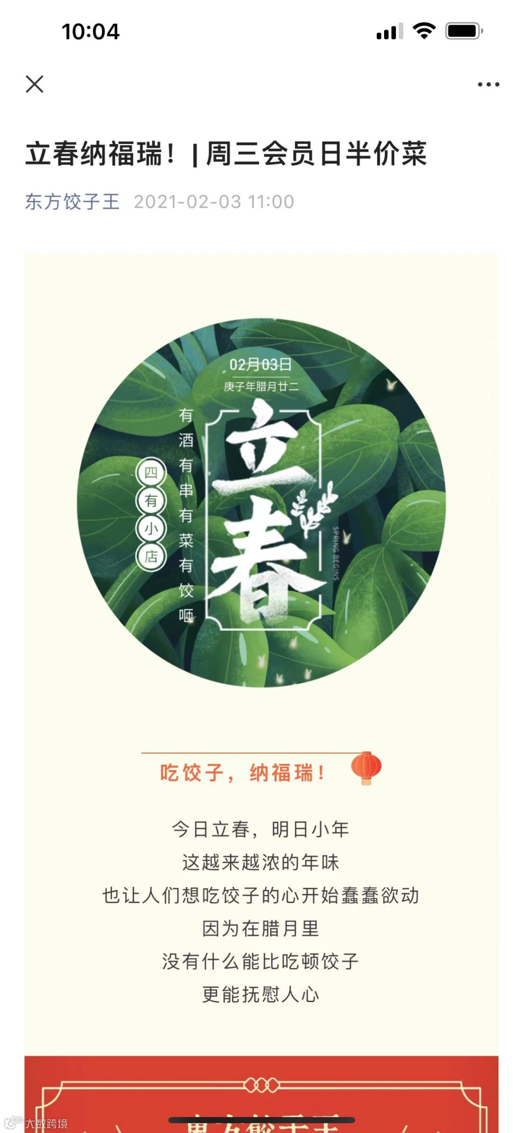 立春,春暖花开,万象更新,今年立春和元宵节差一天,可以结合去做,也可以单独去做,品牌节气推荐图在推文企业微信推送,也可以结合现有门店会员日活动,同时也可以做新品上市。