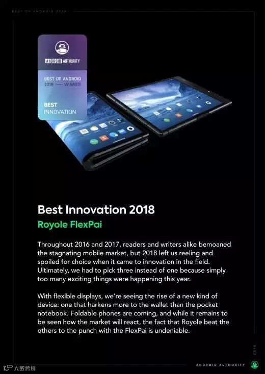 作为柔性屏的消费级终端产品,FlexPai柔派可以将手机和平板电脑的功能和使用体验合二为一,开创了人机交互的新模式和信息生态的新呈现形式。公开资料显示,这款手机曾被著名媒体BBC评为世界通讯行业发展史上的标志性手机,近日也被Android Authority评选为2018年度安卓最佳创新奖。