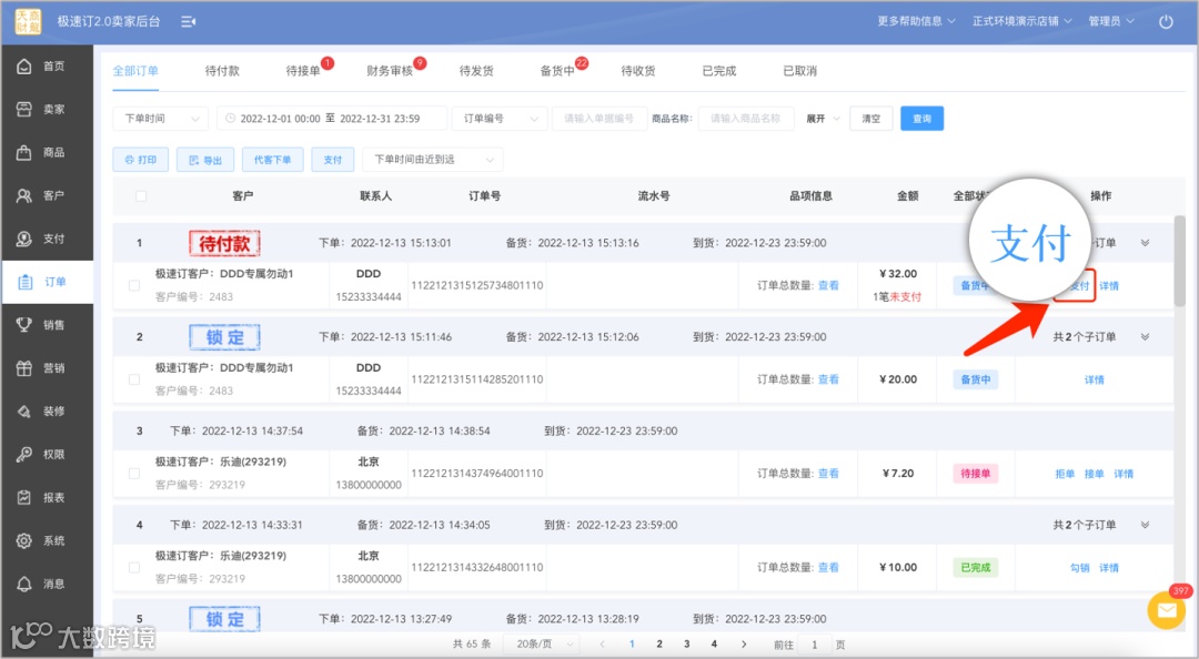 卖家后台员工可以帮客户支付订单,目前支持的支付方式有线下支付、微信支付和微企付。