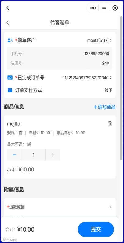 代客退单:选择客户、订单,选择退货商品,提交退单即可完成。