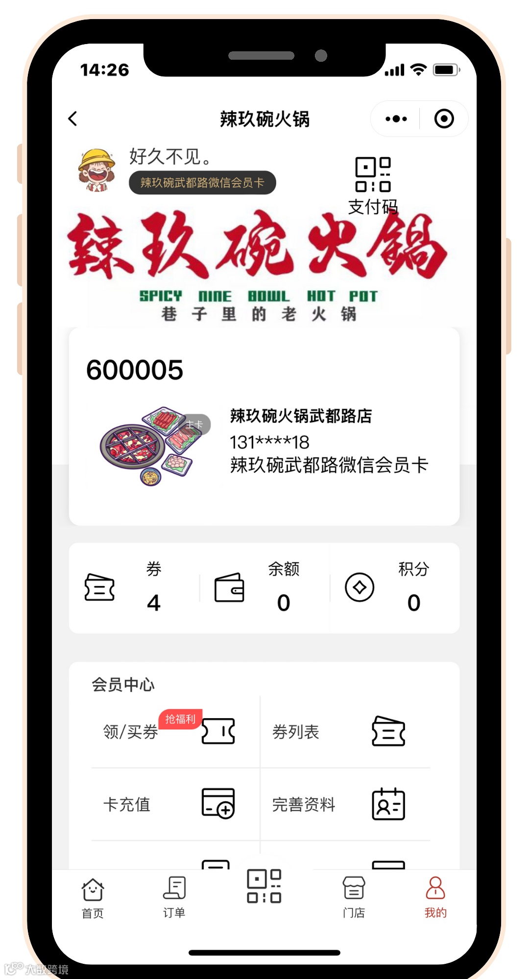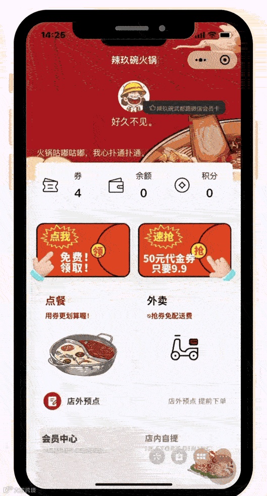 红红火火就是吃火锅的节奏,辣玖碗火锅将小程序首页设计成长图样式,将代金券、储值、积分、会员、社群等各个营销入口充分展现,总有你感兴趣的在这里。