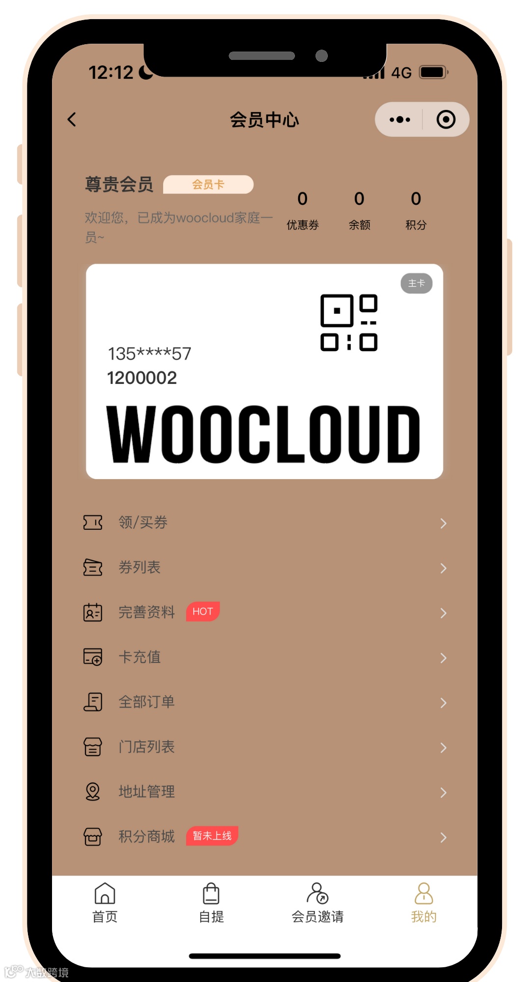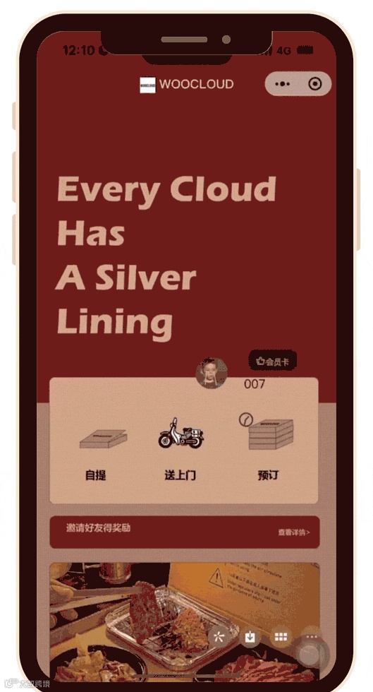 打开WOOCLOUD小程序首页,banner展示品牌的slogan“Every Cloud Has A Silver Lining”传达出品牌的经营理念与信仰。主推的一人食烤肉,自提、外卖、预订便是小程序主推的功能,接下来可以看到邀请好友、优惠券、活动、会员积分等营销入口,还可以直观看到线下门店的餐酒吧环境,吸引顾客前往。