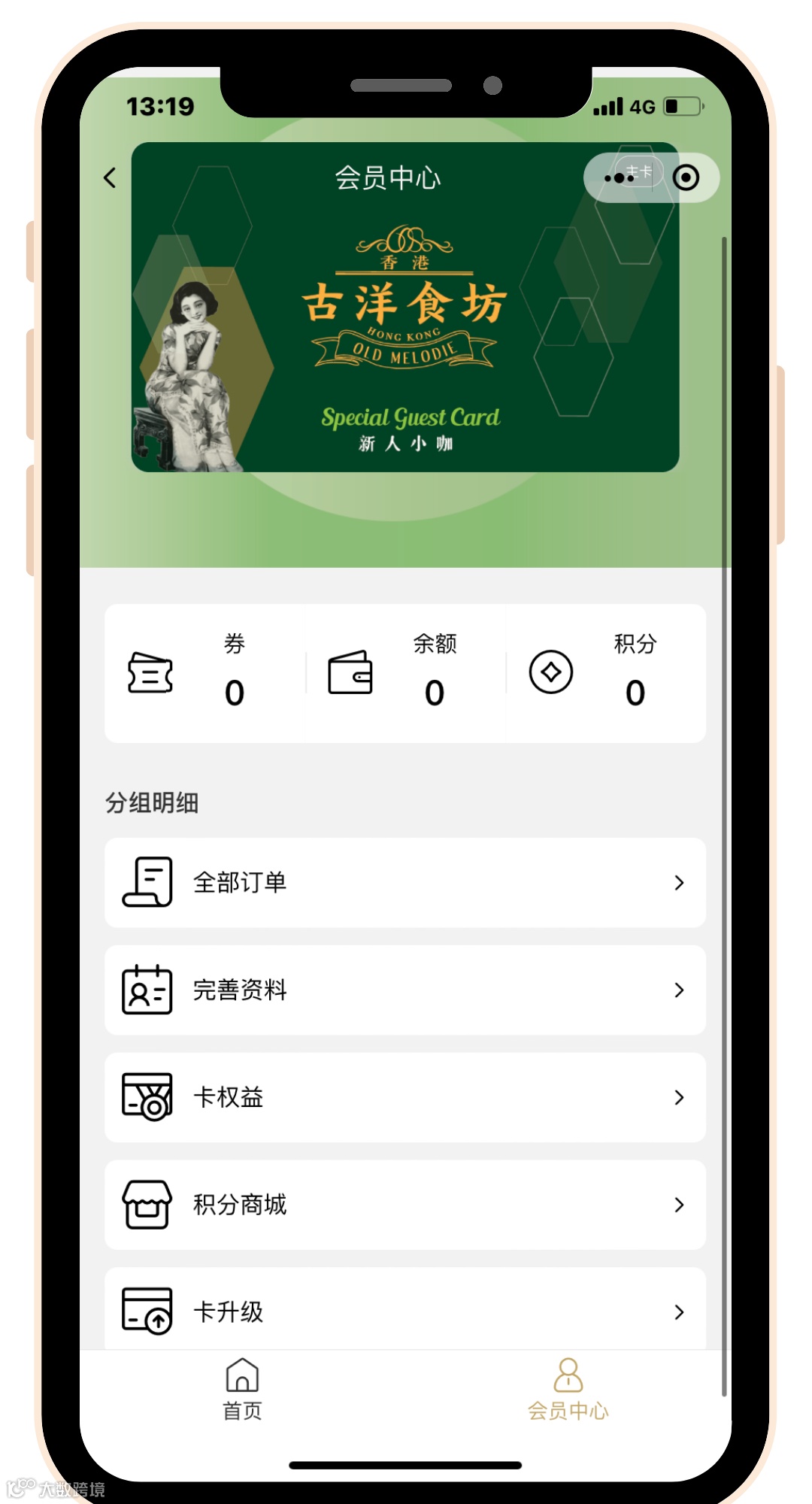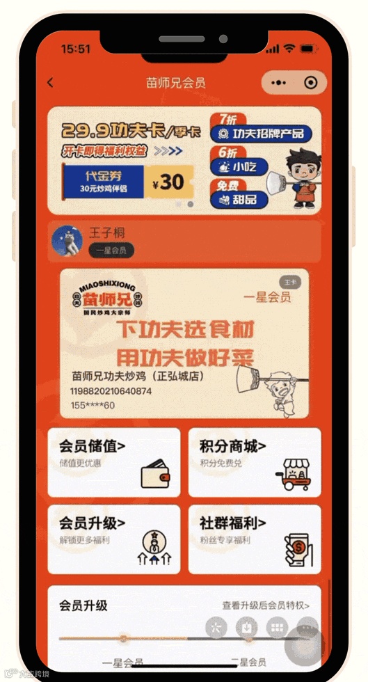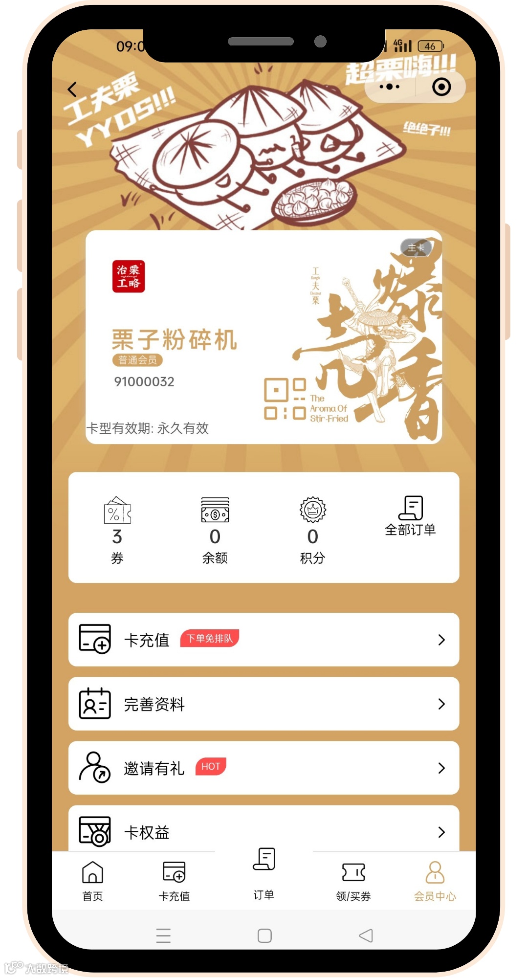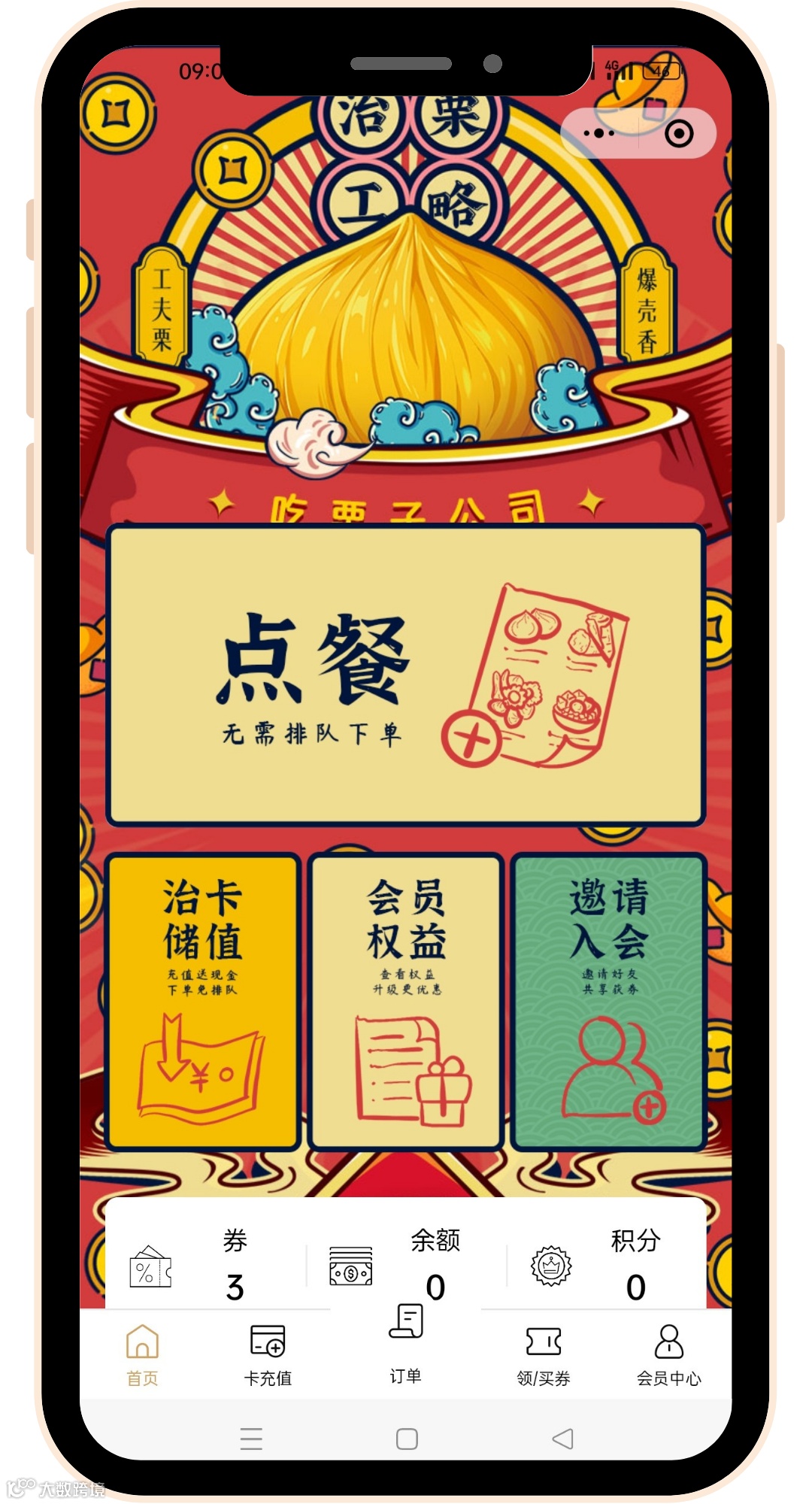 国潮的风格与品牌调性如出一辙,可以看出“玩转”栗子不在话下,非常符合年轻消费者的视觉体验,点餐选项直观,储值、会员权益、邀请入会几个营销入口也很完善,电子会员卡的设计也别具特色。