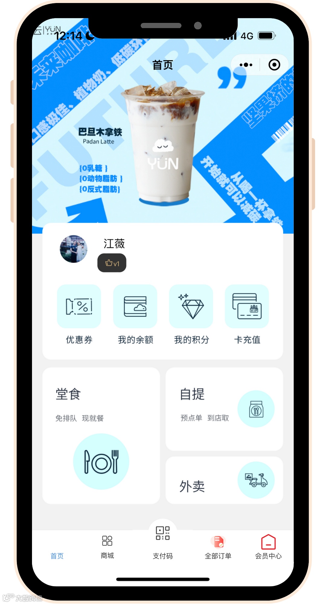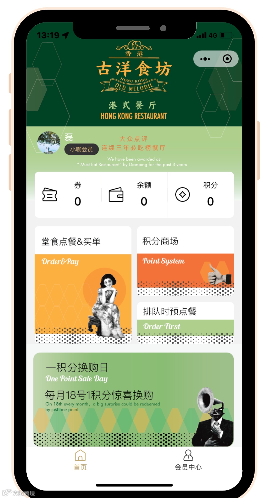 当西式的讲究遇上东方的韵味,就会催生出复古摩登的设计感觉。点餐、买单高效快捷,即便在排队时也可以率先完成预点单。底部banner在不同时期展现不同的会员积分活动,以促进会员的活跃度,提升复购。