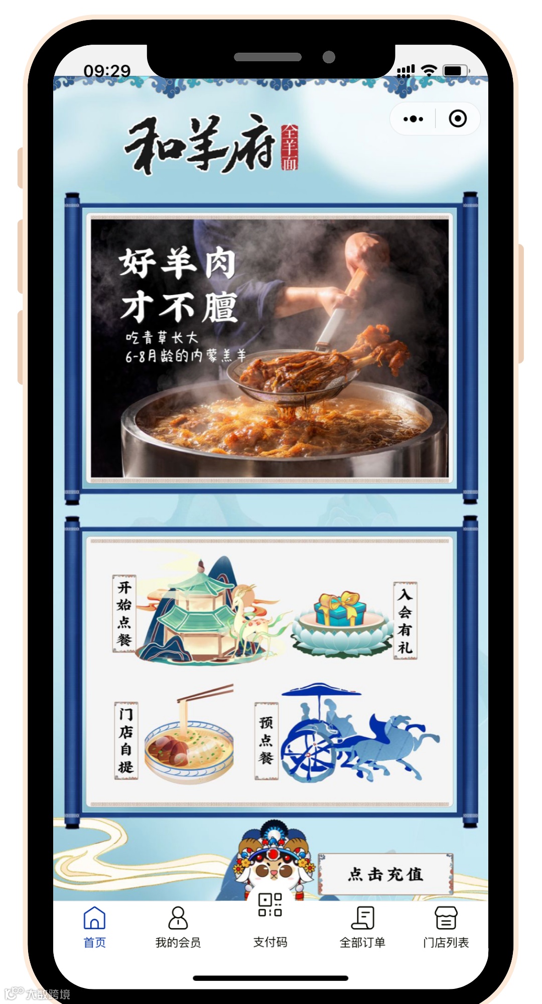 和羊府是一家号称连汤都要喝掉的羊肉店,扫码进入小程序,暖意袭来,将线下店简约古风的设计完美重现,封面banner图与slogan充分展示品牌形象,还能勾起顾客的满满的食欲。