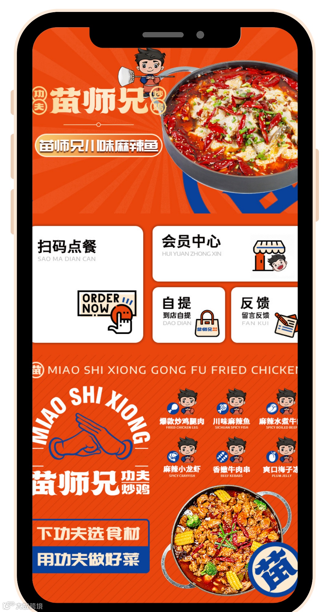 延续橙色的品牌主视觉,将当季主推菜品置于首页banner图处,主推功能下方罗列出六大推荐菜品,引导顾客下单,节省点餐时间,除了扫码点餐、会员中心、自提等,将顾客留言反馈也呈现在首页,突出品牌非常重视用户体验与关怀。