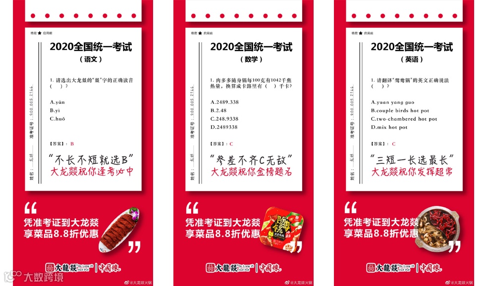 7月6日,大龙燚火锅在官网微博上发布了3张“语数外试卷”海报,以答题的形式、轻松幽默风格,植入品牌、产品及菜品优惠信息,借助热点与用户进行有趣互动的同时,又传递了品牌、促销信息。