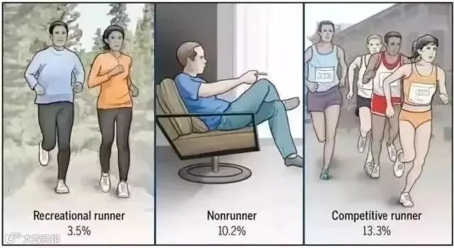 跑步人群的关节炎发生率仅为3.5%,久坐不动人群的关节炎发生率却为10.2%,竞技跑步者的关节炎发生率为13.3%