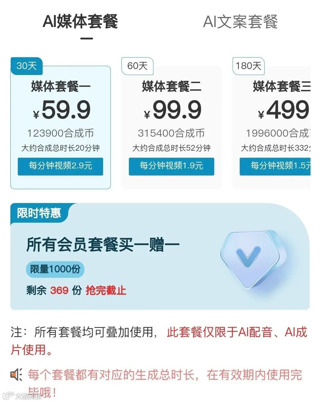 下面的提示,此套餐可以用于AI成片和AI配音使用,也就是说只能用来生成视频和配音,不可以用来写文案。
