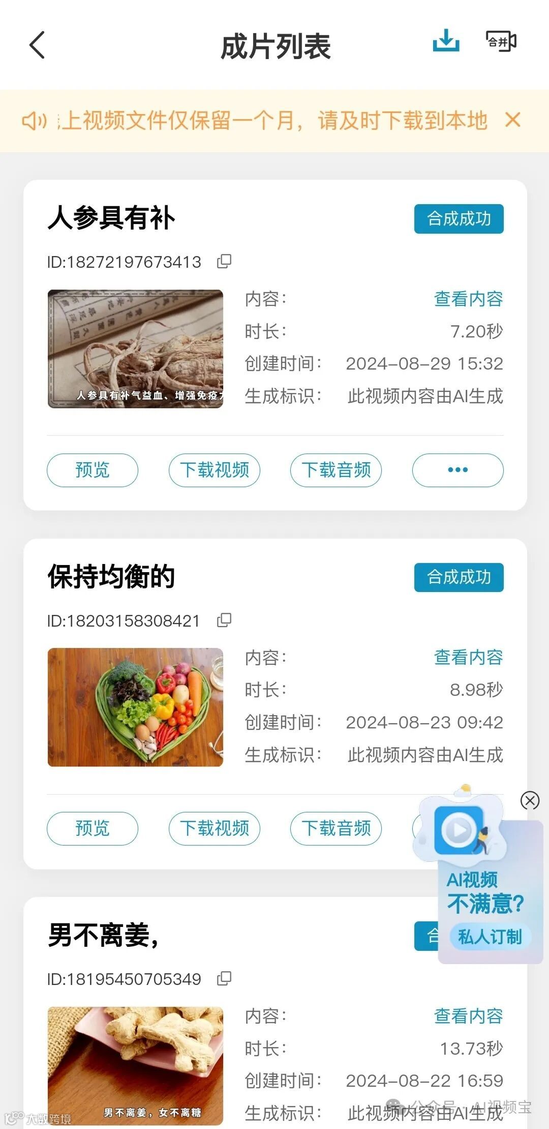 并且右上角有“合并”,代表可以对已经生成的视频,进行合并。