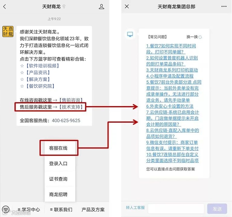 关注天财商龙微信公众号,在菜单栏【联系我们】中找到【客服在线】点击咨询即可。