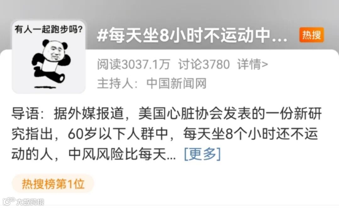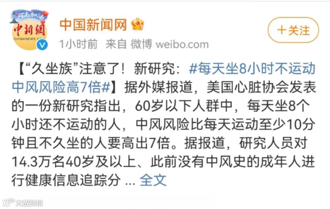 8月30日,中国新闻网发布一则新闻,关于新研究确定“每天坐8小时不运动中风风险高7倍”的报道,持续占据新闻热搜榜第一。