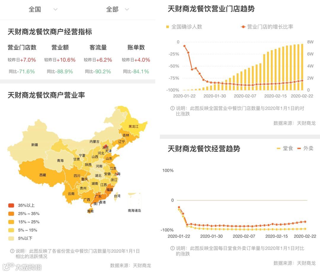 从数据上来看,很多餐企都在试探性的恢复营业。截止2月22日,全国营业门店数已经恢复到去年同期水平的30%左右,这已经比最严重的1月25日提升了20个百分点。而营业额和客流量也均有明显提升,其中营业额相对1月25日提升了7个百分点,客流量则提升了5个百分点。