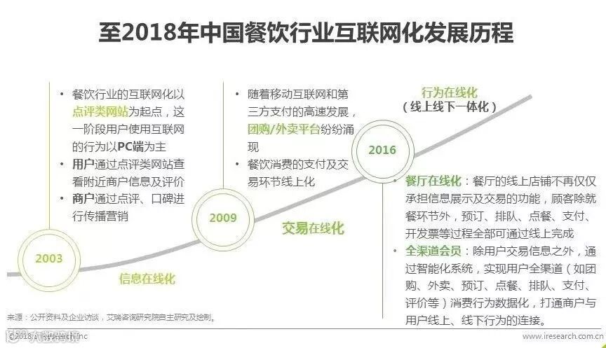 点评类网站的出现,是餐饮行业互联网化的起点,消费者通过餐厅的线上信息及评价,选择就餐地点,互联网成为商户实现口碑营销的重要渠道之一。第三方支付及移动互联网高速发展,团购与外卖迅速爆发,餐饮的交易与支付环节逐步线上化。这一阶段,商户与用户通过互联网平台开始实现浅层连接。随着互联网对餐饮产业链深入的连接与改造,线上线下一体化的新餐饮时代到来,餐饮行业逐步实现线上线下的双向融合。餐厅的功能及服务线上化,让消费者真正实现“来了就吃,吃完就走”。消费者全渠道的消费行为数据化,指导商户的经营与营销,全面提升商户效率。