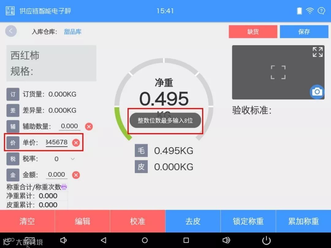 为了保证电子秤与供应链的数量长度位数保持一致,使用电子秤进行收货时,可以手工修改单价和金额,整数位数不得超出八位。