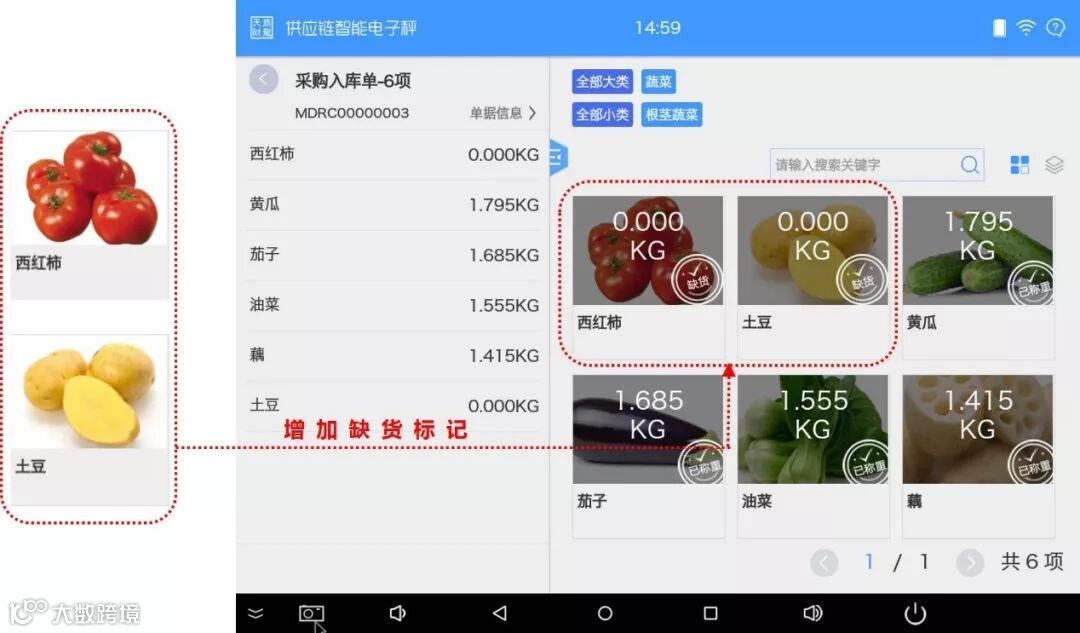 如果收货时因原材料缺货无法称重,那么该品项上传到天财商龙云供应链中的入库数量为0,为了与已称重的品项相互区别,我们增加了“缺货”标记,有了这个标志可以将经过称重操作并且是因为缺货的品项同步到云供应链系统中,为后续品项管理提供便捷。
