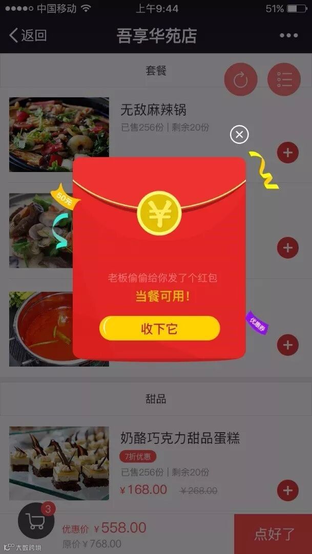 智慧餐厅上线点餐红包,点餐即会员,趣味红包转化随客。不用服务员推荐介绍,不仅省人工,还能省绩效,更可一次把一桌顾客变成会员!