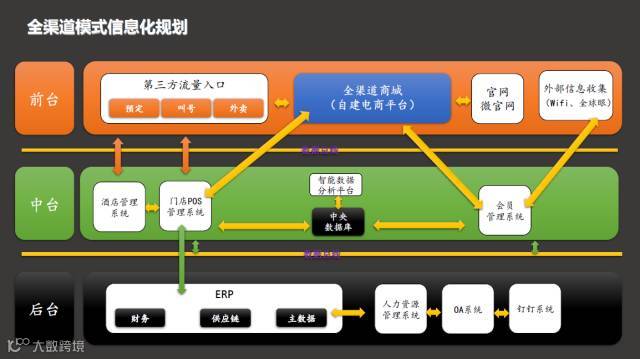 后台是公司内部的管理系统,中台是基于门店的运营系统,前台是线上的第三方流量入口、自建商城平台。后台包括ERP系统,包括财务、供应链、主数据。主数据在很多餐饮公司是被忽略的,主要是因为主数据是分布于各个业务系统当中的。主数据包括物料、价格、供应商、客商,所有主数据在ERP中应该做集中的维护,菜品除外。