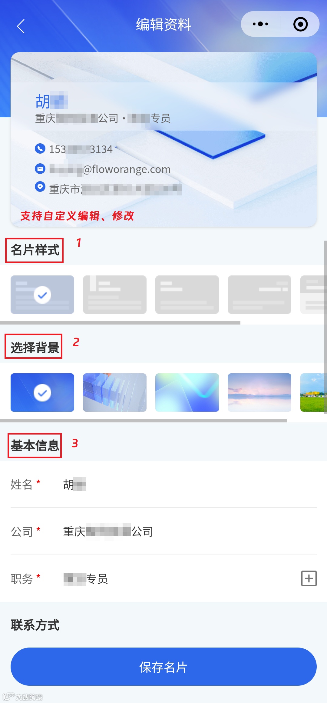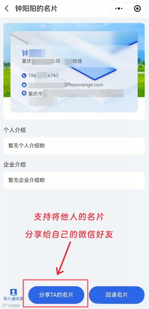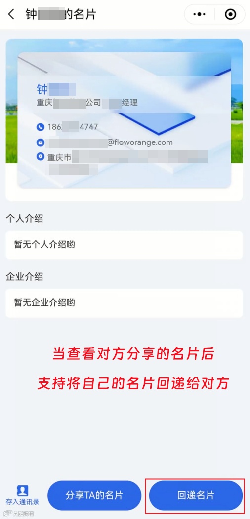 随时按需更新,名片信息永不过期,所有接收者的名片夹都会自动秒变最新版,信息同步,永保新鲜,再也不用担心被老号码糗到了,也不用再挨个向朋友们发消息—“这是我的新号码,请惠存”......