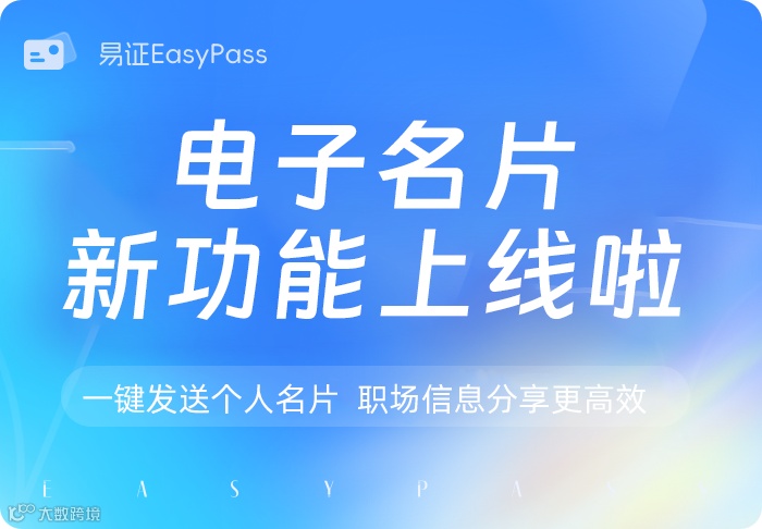 “易证EasyPass”新增“电子名片”功能强势上线,直击传统纸质名片痛点,按需快速创建名片,信息同步灵活便捷,重新定义商务往来新方式,让职场社交变得酷炫又个性。