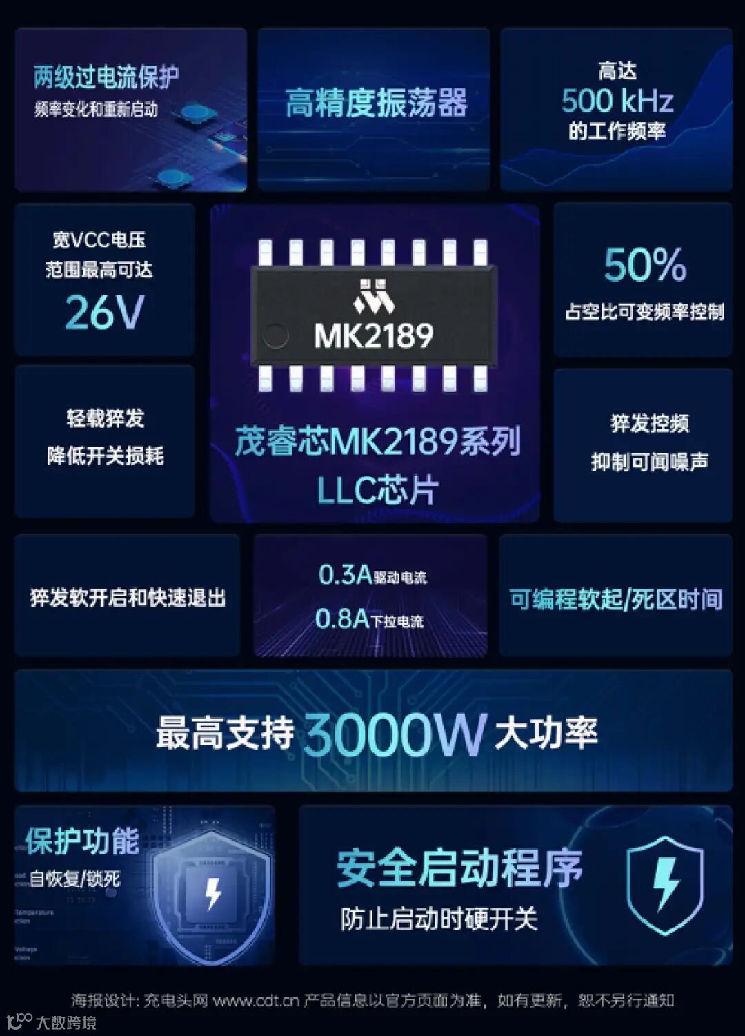 茂睿芯公司的MK2189和MK2562系列芯片代表了PFC+LLC大功率快充解决方案的前沿技术。MK2189系列是一种电压模式LLC控制器,通过调节工作频率和插入死区时间来增强可靠性和效率,特别适用于高功率密度的电源应用,并具有自动猝发模式和全面的保护功能,适应各种负载条件。