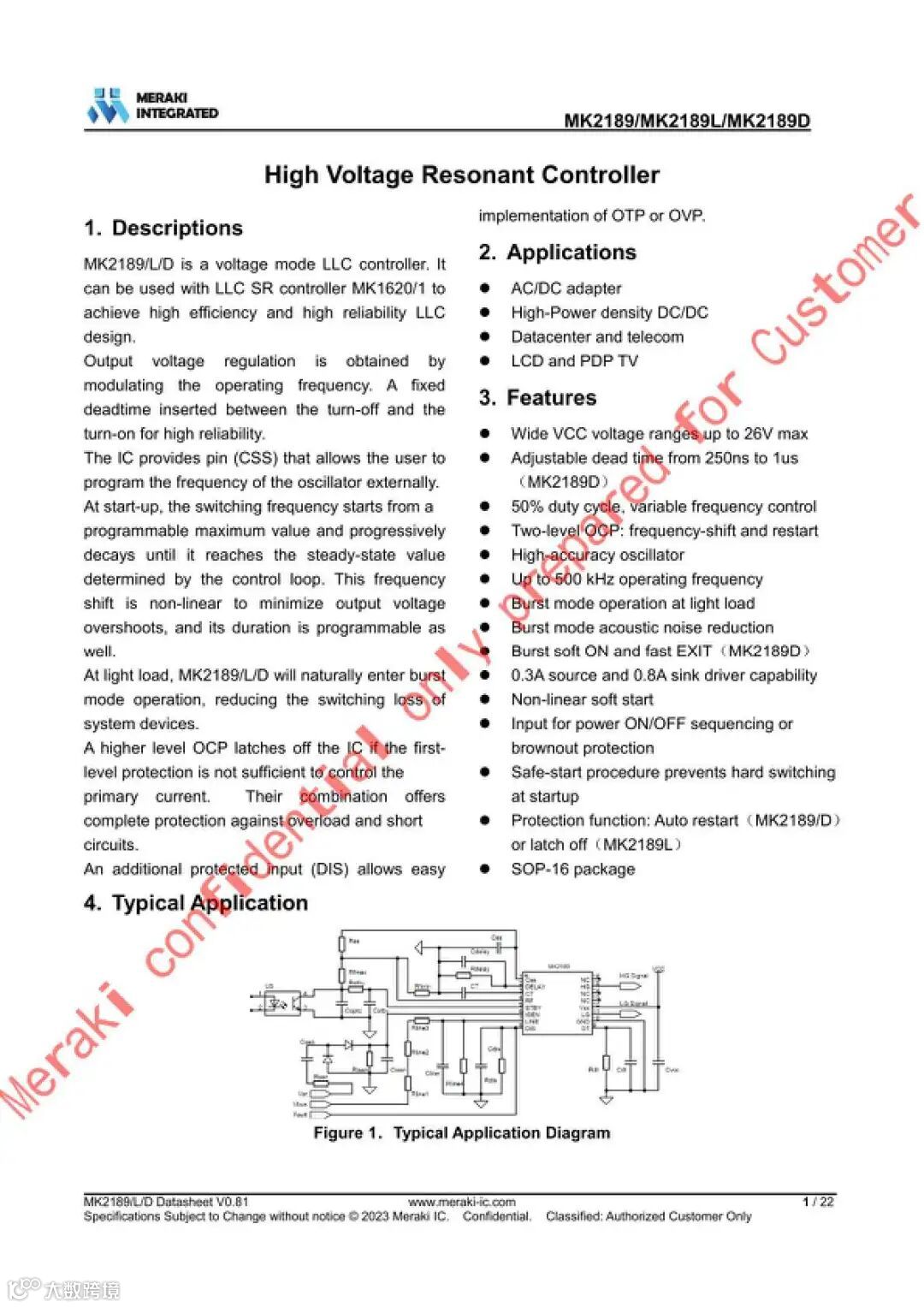 MK2189/L/D是一款电压模式LLC控制器,以电压为主要控制变量,它可与LLC SR控制器MK1620/1搭配使用,实现高效率和高可靠性的LLC设计。