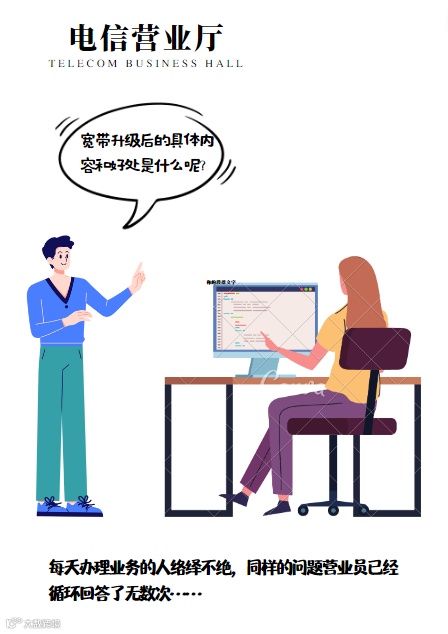 电信营业厅里,办理业务的人络绎不绝,广播叫到下一个号,又是一个办理宽带升级业务的用户,想要咨询宽带升级后的具体内容和好处,虽然这个问题营业员已经回答了无数次,但当下对用户依旧耐心解答,同时还要保持微笑;