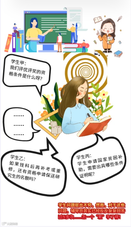 学校办公室,一位辅导员正在奋力敲着键盘,桌子上的手机也响了起来,接起电话把“国家奖学金的申请标准”仔细讲了一遍,放下手机在电脑上继续回复关于“国家奖学金的申请标准”、“挂科补考对毕业是否有影响”的问题……类似内容几乎是天天都有同学在问,同样的答案已经不知道回复了多少次。