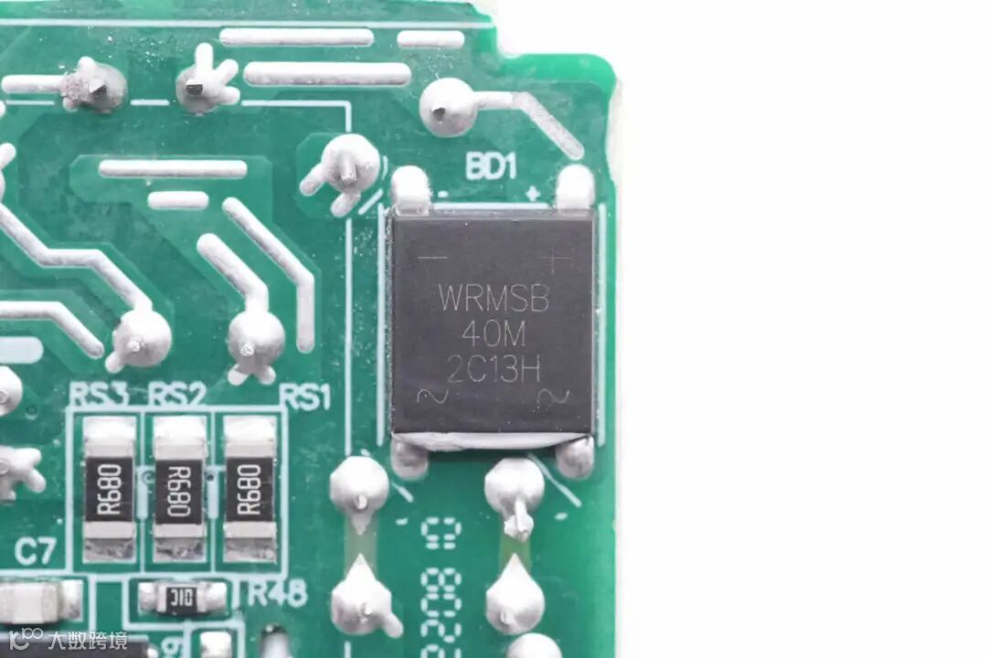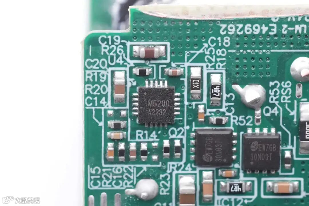 通过对PCBA模块的观察发现,这款充电器采用QR开关电源设计,宽电压范围输出,输出电压由协议芯片控制,通过光耦反馈,实现宽范围电压输出。USB-A口通过降压芯片,实现降压输出。下面我们就从输入端开始了解各个元器件的信息。
