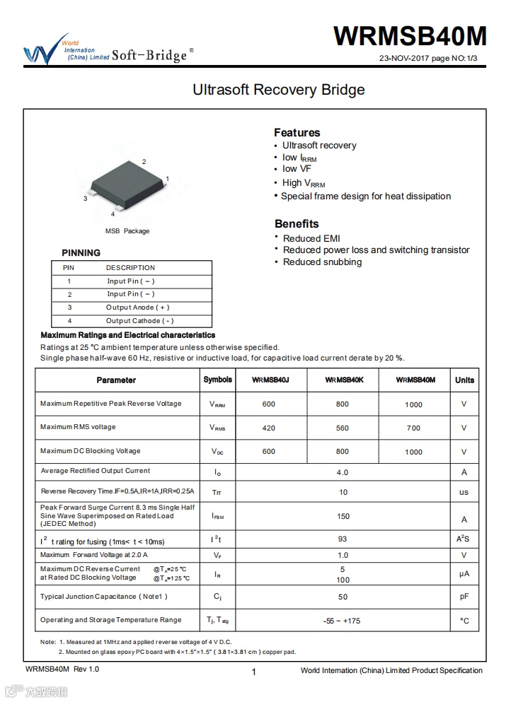 输入端WRMSB40M整流桥来自深圳市沃尔德实业有限公司,规格为4A 1000V。WRMSB40M这颗软桥通过较软的恢复曲线,比较平滑的关断特性,可以降低二极管结电容达到非常少的谐波振荡产生的效果。