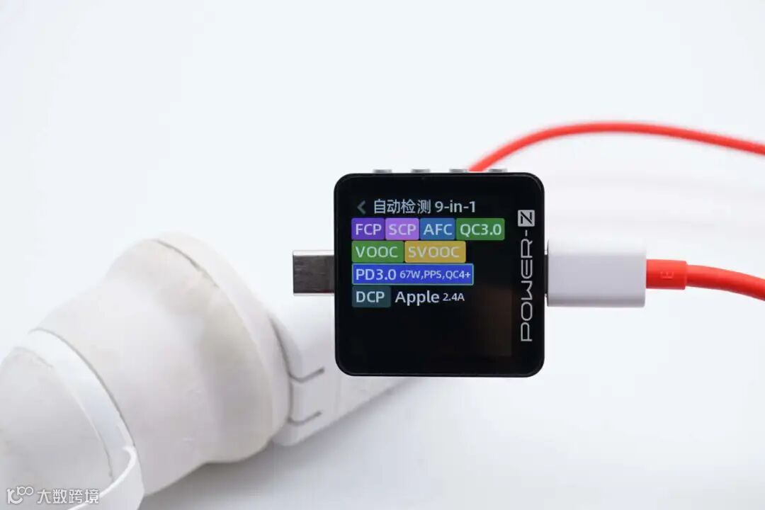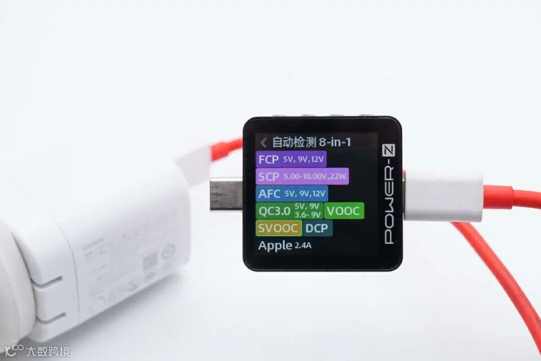 测得USB-A口支持FCP、SCP、AFC、 QC3.0、VOOC、SuperVOOC、DCP、Apple 2.4A充电协议。