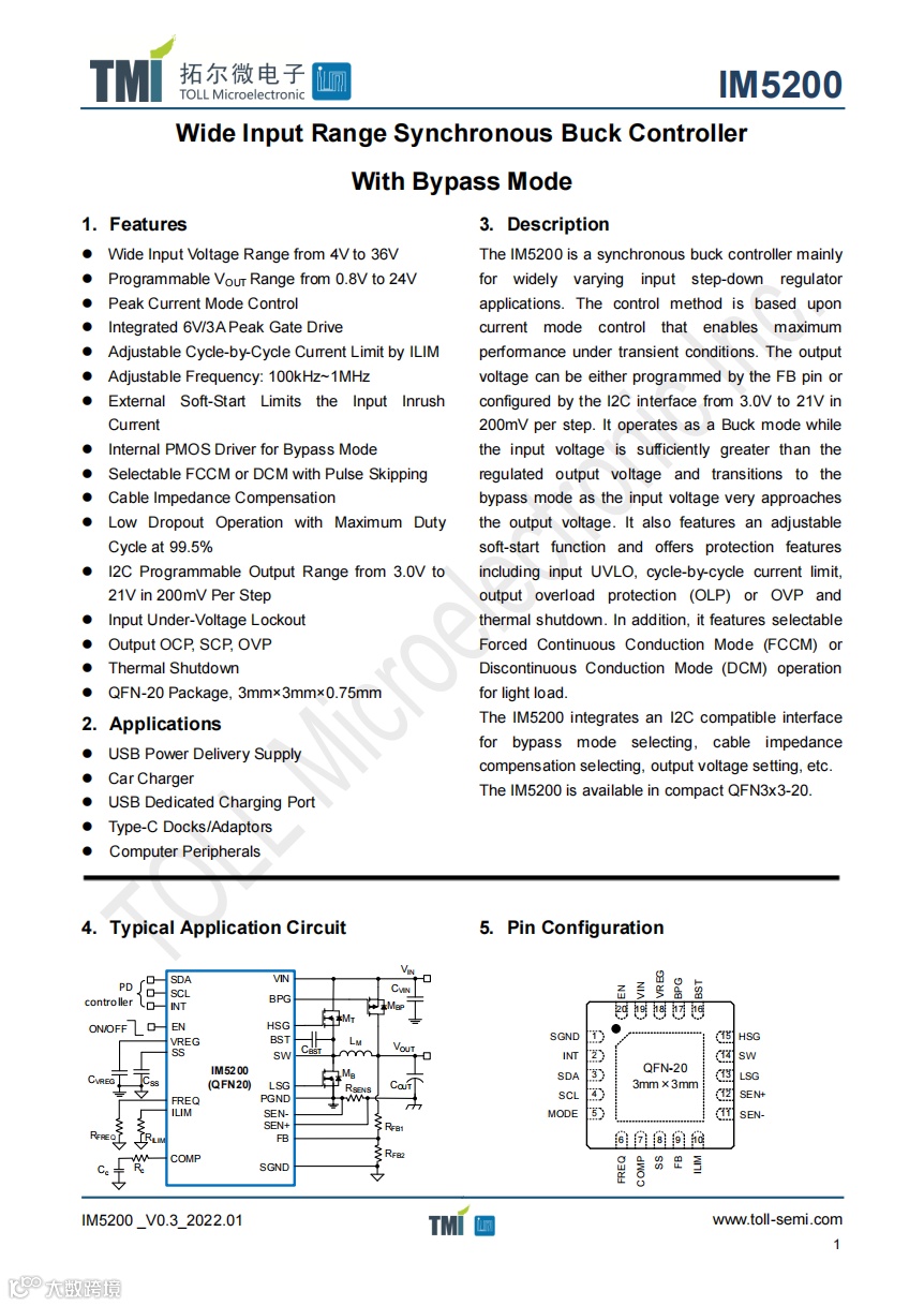 小板背面焊接同步降压转换器,来自拓尔微,型号IM5200,是一款同步高效buck控制器,主要用于宽输入的buck应用。其控制方式为峰值电流控制模式,可在瞬态条件下实现最优性能。输出电压支持电阻分压设置和I2C配置,芯片支持多种保护功能。
