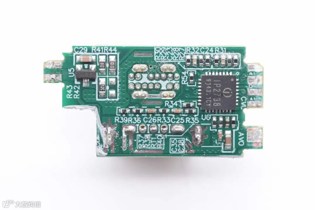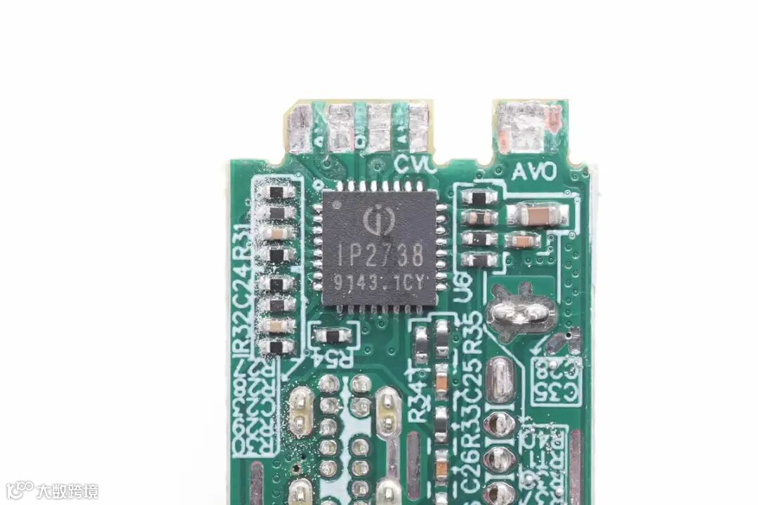 协议芯片采用英集芯IP2738,两个接口输出均由其控制。IP2738是一颗双路协议芯片,支持双口18-140W快充应用,具备独立的反馈控制,具备独立的USB PD控制,相当于两颗IP2736整合到一颗芯片内部,快充规格与IP2736相同。支持USB PD3.1 28V EPR档位,并支持PD3.0/PPS等丰富全面的快充协议,兼容性非常好。