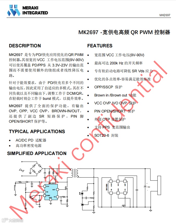 MK2697采用了茂睿芯自主知识产权的驱动技术,同步优化初级和次级功率管电压应力。高达200kHz的工作频率,支持高频小体积的PD快充电源设计。